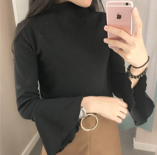 Half height neck Bell sleeve sweater long sleeve t-shirt students top
